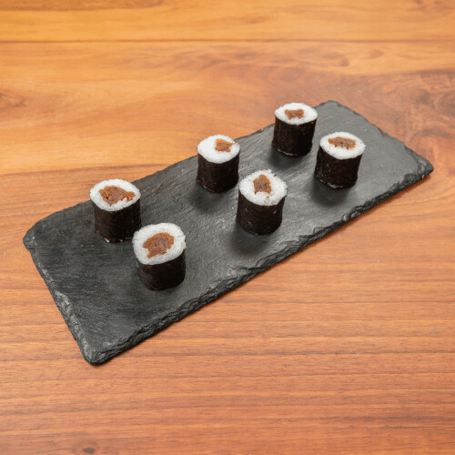 • 4 St. mit Lachsmantel, Avocado, Garnelen und Tobiko (Masago)• 4 St. mit Tempura Garnelen, Lachsmantel, Gurke und Lauchzwiebeln• 6 Lachs Maki• 2 Lachs Nigiri